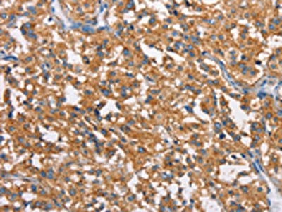 The image on the left is immunohistochemistry of paraffin-embedded Human thyroid cancer tissue using CSB-PA777315(CLTC Antibody) at dilution 1/20, on the right is treated with synthetic peptide. (Original magnification: ×200)