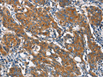 The image on the left is immunohistochemistry of paraffin-embedded Human gastic cancer tissue using CSB-PA777315(CLTC Antibody) at dilution 1/20, on the right is treated with synthetic peptide. (Original magnification: ×200)