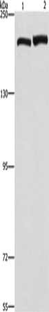Gel: 6%SDS-PAGE, Lysate: 40 μg, Lane 1-2: A172 cells, hela cells, Primary antibody: CSB-PA777315(CLTC Antibody) at dilution 1/300, Secondary antibody: Goat anti rabbit IgG at 1/8000 dilution, Exposure time: 40 seconds