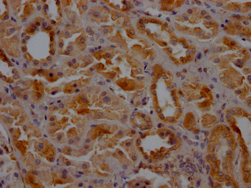 IHC image of CSB-PA005593LA01HU diluted at 1:200 and staining in paraffin-embedded human kidney tissue performed on a Leica BondTM system. After dewaxing and hydration, antigen retrieval was mediated by high pressure in a citrate buffer (pH 6.0). Section was blocked with 10% normal goat serum 30min at RT. Then primary antibody (1% BSA) was incubated at 4°C overnight. The primary is detected by a Goat anti-rabbit polymer IgG labeled by HRP and visualized using 0.05% DAB.