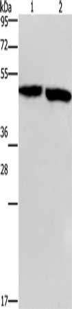 Gel: 8%SDS-PAGE, Lysate: 40 μg, Lane 1-2: Mouse stomach tissue, Mouse brain tissue, Primary antibody: CSB-PA911084(CLUAP1 Antibody) at dilution 1/500, Secondary antibody: Goat anti rabbit IgG at 1/8000 dilution, Exposure time: 1 minute