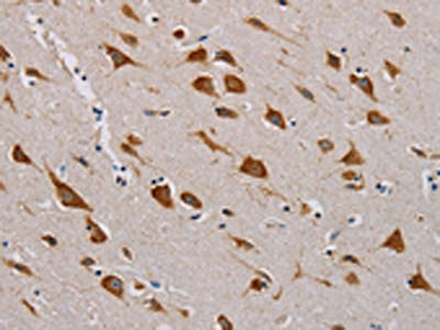 The image on the left is immunohistochemistry of paraffin-embedded Human brain tissue using CSB-PA968805(CMC4 Antibody) at dilution 1/55, on the right is treated with fusion protein. (Original magnification: ×200)