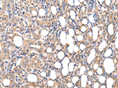 The image on the left is immunohistochemistry of paraffin-embedded Human thyroid cancer tissue using CSB-PA164672(CMKLR1 Antibody) at dilution 1/35, on the right is treated with synthetic peptide. (Original magnification: ×200)