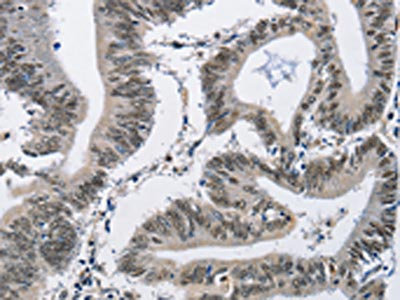 The image on the left is immunohistochemistry of paraffin-embedded Human colon cancer tissue using CSB-PA916076(CMTM2 Antibody) at dilution 1/60, on the right is treated with fusion protein. (Original magnification: ×200)