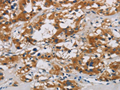 The image is immunohistochemistry of paraffin-embedded Human gastic cancer tissue using CSB-PA439589(CNDP1 Antibody) at dilution 1/30. (Original magnification: ×200)