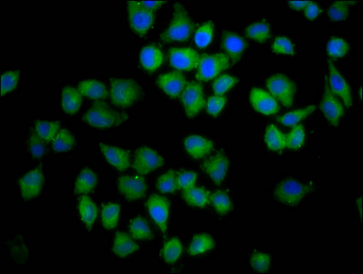 Immunofluorescence staining of Hela cells with CSB-PA005641LA01HU at 1:100, counter-stained with DAPI. The cells were fixed in 4% formaldehyde, permeabilized using 0.2% Triton X-100 and blocked in 10% normal Goat Serum. The cells were then incubated with the antibody overnight at 4°C. The secondary antibody was Alexa Fluor 488-congugated AffiniPure Goat Anti-Rabbit IgG(H+L).