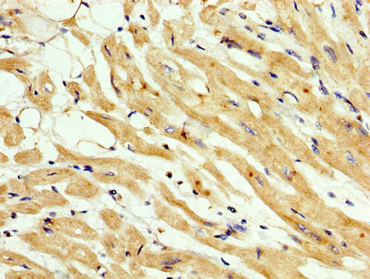 IHC image of CSB-PA843333LA01HU diluted at 1:200 and staining in paraffin-embedded human heart tissue performed on a Leica BondTM system. After dewaxing and hydration, antigen retrieval was mediated by high pressure in a citrate buffer (pH 6.0). Section was blocked with 10% normal goat serum 30min at RT. Then primary antibody (1% BSA) was incubated at 4°C overnight. The primary is detected by a biotinylated secondary antibody and visualized using an HRP conjugated SP system.