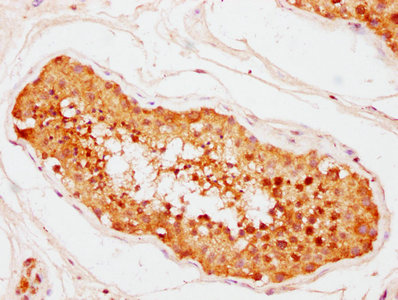 IHC image of CSB-PA884495LA01HU diluted at 1:400 and staining in paraffin-embedded human testis tissue performed on a Leica BondTM system. After dewaxing and hydration, antigen retrieval was mediated by high pressure in a citrate buffer (pH 6.0). Section was blocked with 10% normal goat serum 30min at RT. Then primary antibody (1% BSA) was incubated at 4°C overnight. The primary is detected by a biotinylated secondary antibody and visualized using an HRP conjugated SP system.