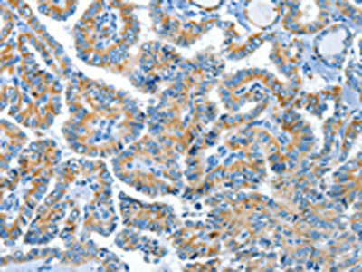 The image on the left is immunohistochemistry of paraffin-embedded Human thyroid cancer tissue using CSB-PA783442(COG1 Antibody) at dilution 1/60, on the right is treated with synthetic peptide. (Original magnification: ×200)