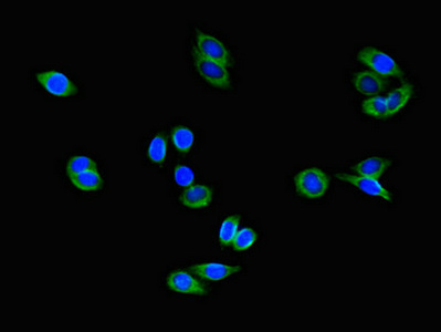 Immunofluorescent analysis of HepG2 cells using CSB-PA818712LA01HU at dilution of 1:100 and Alexa Fluor 488-congugated AffiniPure Goat Anti-Rabbit IgG(H+L)