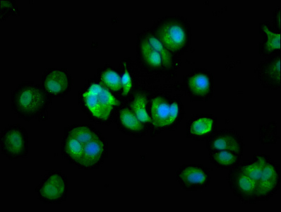 Immunofluorescence staining of MCF-7 cells with CSB-PA866200LA01HU at 1:133, counter-stained with DAPI. The cells were fixed in 4% formaldehyde, permeabilized using 0.2% Triton X-100 and blocked in 10% normal Goat Serum. The cells were then incubated with the antibody overnight at 4°C. The secondary antibody was Alexa Fluor 488-congugated AffiniPure Goat Anti-Rabbit IgG(H+L).