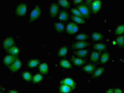 Immunofluorescent analysis of A549 cells using CSB-PA839305LA01HU at dilution of 1:100 and Alexa Fluor 488-congugated AffiniPure Goat Anti-Rabbit IgG(H+L)