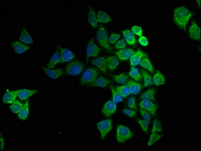Immunofluorescence staining of Hela cells with CSB-PA00414A0Rb at 1:166, counter-stained with DAPI. The cells were fixed in 4% formaldehyde, permeabilized using 0.2% Triton X-100 and blocked in 10% normal Goat Serum. The cells were then incubated with the antibody overnight at 4°C. The secondary antibody was Alexa Fluor 488-congugated AffiniPure Goat Anti-Rabbit IgG(H+L).