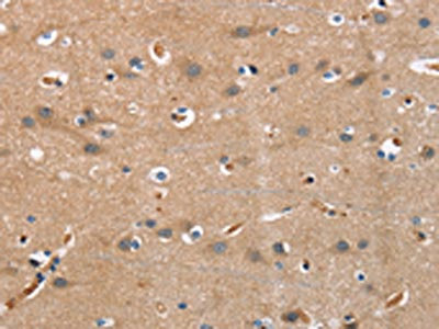 The image on the left is immunohistochemistry of paraffin-embedded Human brain tissue using CSB-PA584549(COX5A Antibody) at dilution 1/25, on the right is treated with synthetic peptide. (Original magnification: ×200)