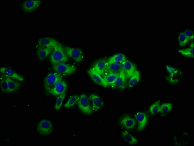 Immunofluorescence staining of HepG2 cells with CSB-PA005902LA01HU at 1:66, counter-stained with DAPI. The cells were fixed in 4% formaldehyde, permeabilized using 0.2% Triton X-100 and blocked in 10% normal Goat Serum. The cells were then incubated with the antibody overnight at 4°C. The secondary antibody was Alexa Fluor 488-congugated AffiniPure Goat Anti-Rabbit IgG(H+L).