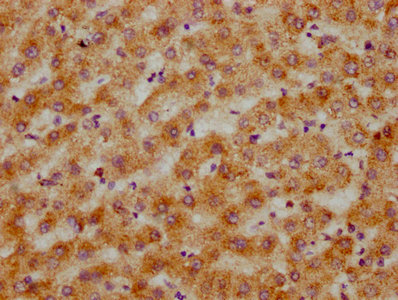 IHC image of CSB-PA005902LA01HU diluted at 1:200 and staining in paraffin-embedded human liver tissue performed on a Leica BondTM system. After dewaxing and hydration, antigen retrieval was mediated by high pressure in a citrate buffer (pH 6.0). Section was blocked with 10% normal goat serum 30min at RT. Then primary antibody (1% BSA) was incubated at 4°C overnight. The primary is detected by a biotinylated secondary antibody and visualized using an HRP conjugated SP system.