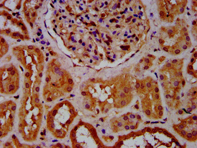 IHC image of CSB-PA773062LA01HU diluted at 1:600 and staining in paraffin-embedded human kidney tissue performed on a Leica BondTM system. After dewaxing and hydration, antigen retrieval was mediated by high pressure in a citrate buffer (pH 6.0). Section was blocked with 10% normal goat serum 30min at RT. Then primary antibody (1% BSA) was incubated at 4°C overnight. The primary is detected by a biotinylated secondary antibody and visualized using an HRP conjugated SP system.