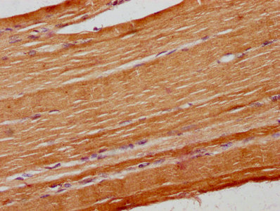 IHC image of CSB-PA871558LA01HU diluted at 1:400 and staining in paraffin-embedded human skeletal muscle tissue performed on a Leica BondTM system. After dewaxing and hydration, antigen retrieval was mediated by high pressure in a citrate buffer (pH 6.0). Section was blocked with 10% normal goat serum 30min at RT. Then primary antibody (1% BSA) was incubated at 4°C overnight. The primary is detected by a biotinylated secondary antibody and visualized using an HRP conjugated SP system.