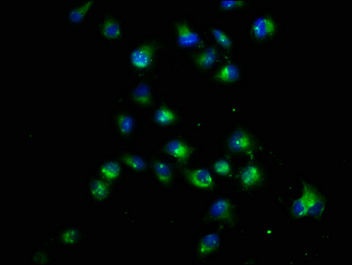 Immunofluorescence staining of Hela cells with CSB-PA005941DSR1HU at 1:22, counter-stained with DAPI. The cells were fixed in 4% formaldehyde, permeabilized using 0.2% Triton X-100 and blocked in 10% normal Goat Serum. The cells were then incubated with the antibody overnight at 4°C. The secondary antibody was Alexa Fluor 488-congugated AffiniPure Goat Anti-Rabbit IgG(H+L).