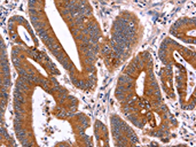 The image on the left is immunohistochemistry of paraffin-embedded Human colon cancer tissue using CSB-PA951162(CRISP3 Antibody) at dilution 1/40, on the right is treated with fusion protein. (Original magnification: ×200)