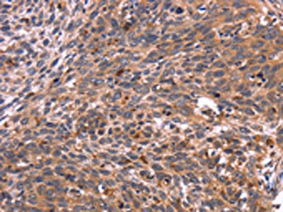 The image on the left is immunohistochemistry of paraffin-embedded Human cervical cancer tissue using CSB-PA223350(CRK Antibody) at dilution 1/40, on the right is treated with fusion protein. (Original magnification: ×200)