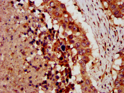 IHC image of CSB-PA005982LA01HU diluted at 1:300 and staining in paraffin-embedded human lung cancer performed on a Leica BondTM system. After dewaxing and hydration, antigen retrieval was mediated by high pressure in a citrate buffer (pH 6.0). Section was blocked with 10% normal goat serum 30min at RT. Then primary antibody (1% BSA) was incubated at 4°C overnight. The primary is detected by a biotinylated secondary antibody and visualized using an HRP conjugated SP system.
