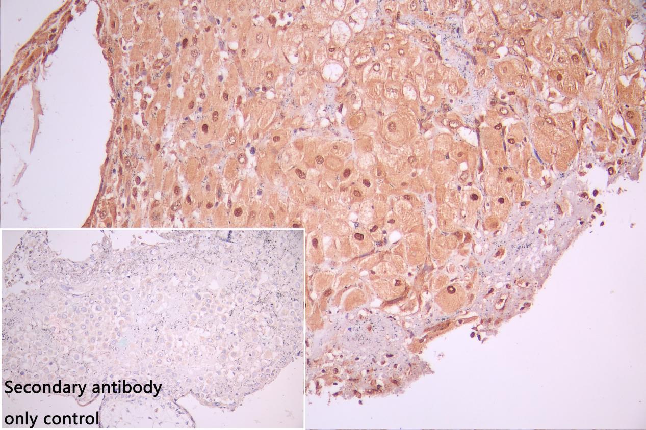 IHC image of CSB-PA757785LA01HU diluted at 1:50 and staining in paraffin-embedded human glioma cancer performed on a Leica BondTM system. After dewaxing and hydration, antigen retrieval was mediated by high pressure in a citrate buffer (pH 6.0). Section was blocked with 10% normal goat serum 30min at RT. Then primary antibody (1% BSA) was incubated at 4°C overnight. The primary is detected by a Goat anti-rabbit polymer IgG labeled by HRP and visualized using 0.05% DAB. Secondary antibody only control: uses 1% BSA instead of primary antibody