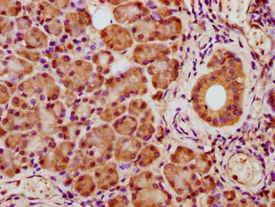 IHC image of CSB-PA600843LA01HU diluted at 1:400 and staining in paraffin-embedded human pancreatic tissue performed on a Leica BondTM system. After dewaxing and hydration, antigen retrieval was mediated by high pressure in a citrate buffer (pH 6.0). Section was blocked with 10% normal goat serum 30min at RT. Then primary antibody (1% BSA) was incubated at 4°C overnight. The primary is detected by a biotinylated secondary antibody and visualized using an HRP conjugated SP system.