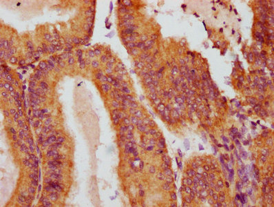 IHC image of CSB-PA600843LA01HU diluted at 1:400 and staining in paraffin-embedded human endometrial cancer performed on a Leica BondTM system. After dewaxing and hydration, antigen retrieval was mediated by high pressure in a citrate buffer (pH 6.0). Section was blocked with 10% normal goat serum 30min at RT. Then primary antibody (1% BSA) was incubated at 4°C overnight. The primary is detected by a biotinylated secondary antibody and visualized using an HRP conjugated SP system.