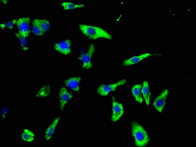 Immunofluorescence staining of HepG2 cells with CSB-PA860321LA01HU at 1:100, counter-stained with DAPI. The cells were fixed in 4% formaldehyde, permeabilized using 0.2% Triton X-100 and blocked in 10% normal Goat Serum. The cells were then incubated with the antibody overnight at 4°C. The secondary antibody was Alexa Fluor 488-congugated AffiniPure Goat Anti-Rabbit IgG(H+L).