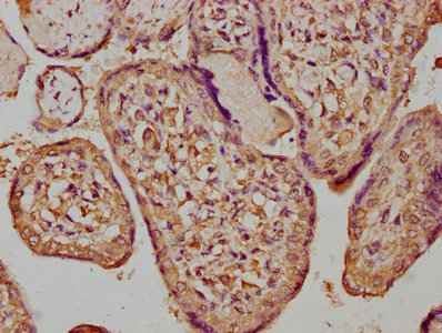 IHC image of CSB-PA860321LA01HU diluted at 1:300 and staining in paraffin-embedded human placenta tissue performed on a Leica BondTM system. After dewaxing and hydration, antigen retrieval was mediated by high pressure in a citrate buffer (pH 6.0). Section was blocked with 10% normal goat serum 30min at RT. Then primary antibody (1% BSA) was incubated at 4°C overnight. The primary is detected by a biotinylated secondary antibody and visualized using an HRP conjugated SP system.
