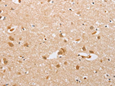 The image on the left is immunohistochemistry of paraffin-embedded Human brain tissue using CSB-PA994683(CSGALNACT2 Antibody) at dilution 1/30, on the right is treated with fusion protein. (Original magnification: ×200)