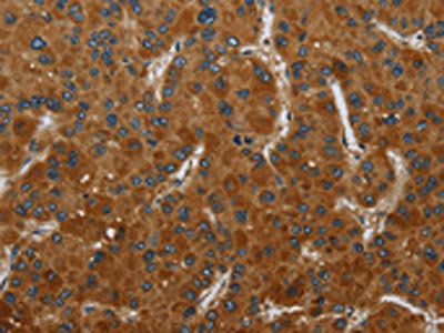 The image on the left is immunohistochemistry of paraffin-embedded Human liver cancer tissue using CSB-PA696449(CSH1 Antibody) at dilution 1/50, on the right is treated with fusion protein. (Original magnification: ×200)