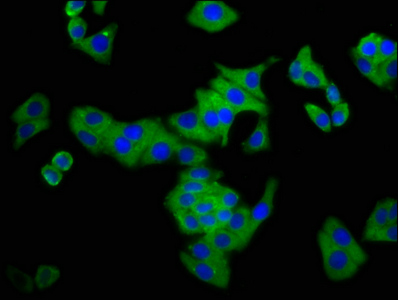 Immunofluorescence staining of HepG2 cells with CSB-PA800102LA01HU at 1: 133, counter-stained with DAPI. The cells were fixed in 4% formaldehyde, permeabilized tissue using 0.2% Triton X-100 and blocked in 10% normal Goat Serum. The cells were then incubated with the antibody overnight at 4°C.The secondary antibody was Alexa Fluor 488-congugated AffiniPure Goat Anti-Rabbit IgG(H+L) .