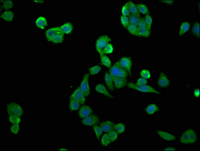 Immunofluorescence staining of HepG2 cells with CSB-PA526319HA01HU at 1:66, counter-stained with DAPI. The cells were fixed in 4% formaldehyde, permeabilized using 0.2% Triton X-100 and blocked in 10% normal Goat Serum. The cells were then incubated with the antibody overnight at 4°C. The secondary antibody was Alexa Fluor 488-congugated AffiniPure Goat Anti-Rabbit IgG(H+L).