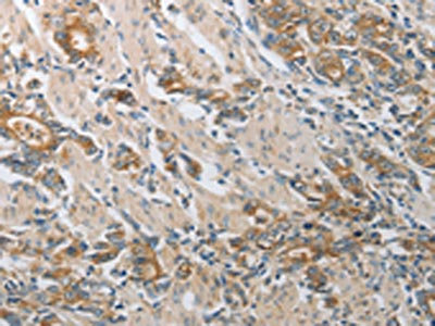 The image on the left is immunohistochemistry of paraffin-embedded Human gastic cancer tissue using CSB-PA592744(CST3 Antibody) at dilution 1/50, on the right is treated with synthetic peptide. (Original magnification: ×200)