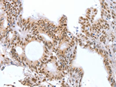 The image on the left is immunohistochemistry of paraffin-embedded Human colon cancer tissue using CSB-PA062537(CTBP2 Antibody) at dilution 1/25, on the right is treated with fusion protein. (Original magnification: ×200)