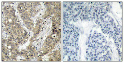 Immunohistochemical analysis of paraffin-embedded human breast carcinoma tissue using b-Catenin(Ab-37) Antibody(left) or the same antibody preincubated with blocking peptide(right).
