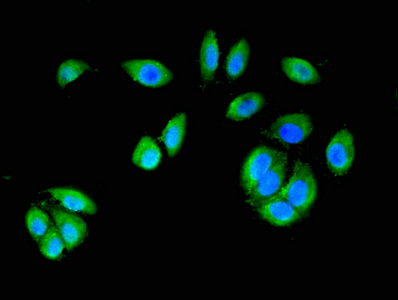 Immunofluorescent analysis of A549 cells using CSB-PA006172LA01HU at dilution of 1:100 and Alexa Fluor 488-congugated AffiniPure Goat Anti-Rabbit IgG(H+L)