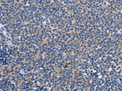 The image on the left is immunohistochemistry of paraffin-embedded Human Lymphoma tissue using CSB-PA358929(CTSC Antibody) at dilution 1/25, on the right is treated with synthetic peptide. (Original magnification: ×200)