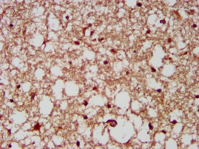 IHC image of CSB-PA614451LA01HU diluted at 1:200 and staining in paraffin-embedded human brain tissue performed on a Leica BondTM system. After dewaxing and hydration, antigen retrieval was mediated by high pressure in a citrate buffer (pH 6.0). Section was blocked with 10% normal goat serum 30min at RT. Then primary antibody (1% BSA) was incubated at 4°C overnight. The primary is detected by a biotinylated secondary antibody and visualized using an HRP conjugated SP system.