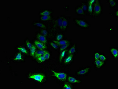 Immunofluorescent analysis of HepG2 cells using CSB-PA859832LA01HU at dilution of 1:100 and Alexa Fluor 488-congugated AffiniPure Goat Anti-Rabbit IgG(H+L)
