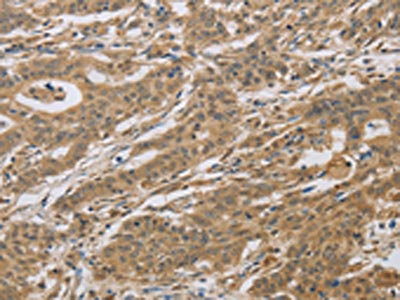The image on the left is immunohistochemistry of paraffin-embedded Human gastric cancer tissue using CSB-PA122670(CYFIP2 Antibody) at dilution 1/25, on the right is treated with fusion protein. (Original magnification: ×200)