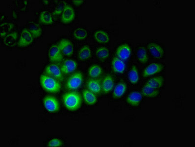 Immunofluorescent analysis of A549 cells using CSB-PA006392EA01HU at dilution of 1:100 and Alexa Fluor 488-congugated AffiniPure Goat Anti-Rabbit IgG(H+L)