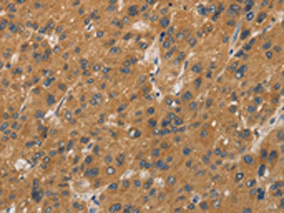 The image on the left is immunohistochemistry of paraffin-embedded Human liver cancer tissue using CSB-PA074176(CYP17A1 Antibody) at dilution 1/20, on the right is treated with fusion protein. (Original magnification: ×200)