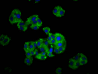 Immunofluorescence staining of HepG2 cells with CSB-PA751026LA01HU at 1:166, counter-stained with DAPI. The cells were fixed in 4% formaldehyde, permeabilized using 0.2% Triton X-100 and blocked in 10% normal Goat Serum. The cells were then incubated with the antibody overnight at 4°C. The secondary antibody was Alexa Fluor 488-congugated AffiniPure Goat Anti-Rabbit IgG(H+L).