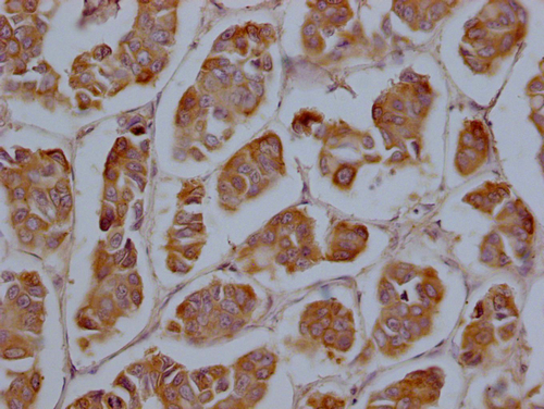 IHC image of CSB-PA621969LA01HU diluted at 1:200 and staining in paraffin-embedded human breast cancer performed on a Leica BondTM system. After dewaxing and hydration, antigen retrieval was mediated by high pressure in a citrate buffer (pH 6.0). Section was blocked with 10% normal goat serum 30min at RT. Then primary antibody (1% BSA) was incubated at 4°C overnight. The primary is detected by a Goat anti-rabbit polymer IgG labeled by HRP and visualized using 0.05% DAB.