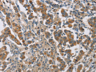 The image on the left is immunohistochemistry of paraffin-embedded Human breast cancer tissue using CSB-PA913264(CYP4A11 Antibody) at dilution 1/25, on the right is treated with fusion protein. (Original magnification: ×200)