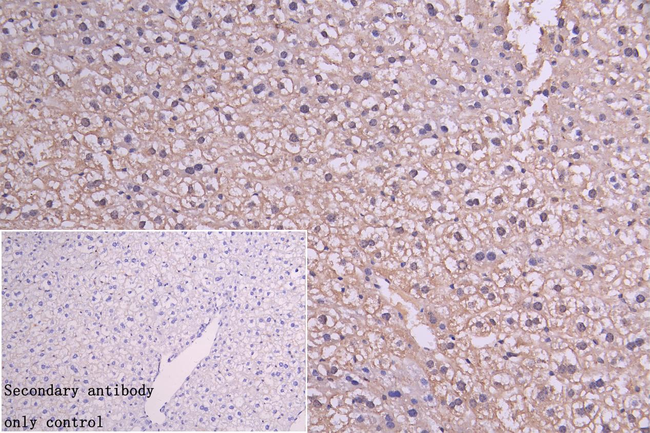 IHC image of CSB-PA006460LA01HU diluted at 1:150 and staining in paraffin-embedded mouse liver tissue performed on a Leica BondTM system. After dewaxing and hydration, antigen retrieval was mediated by high pressure in a citrate buffer (pH 6.0). Section was blocked with 10% normal goat serum 30min at RT. Then primary antibody (1% BSA) was incubated at 4°C overnight. The primary is detected by a Goat anti-rabbit polymer IgG labeled by HRP and visualized using 0.05% DAB. Secondary antibody only control: uses 1% BSA instead of primary antibody