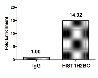Chromatin Immunoprecipitation Hela (106, treated with 30mM sodium crotonylate for 4h) were treated with Micrococcal Nuclease, sonicated, and immunoprecipitated with 5µg anti-HIST1H2BC (CSB-PA010403OA20crHU) or a control normal rabbit IgG. The resulting ChIP DNA was quantified using real-time PCR with primers against the β-Globin promoter.